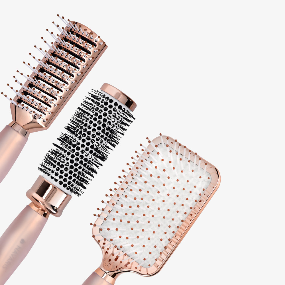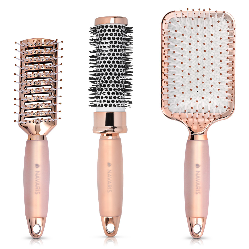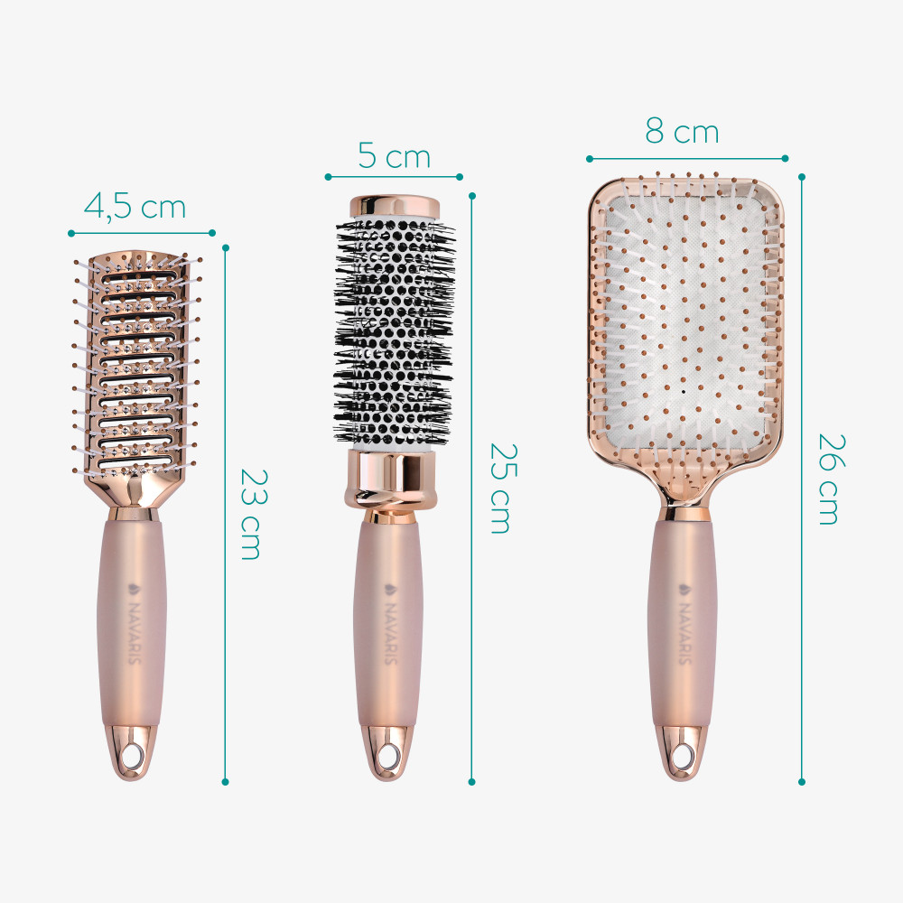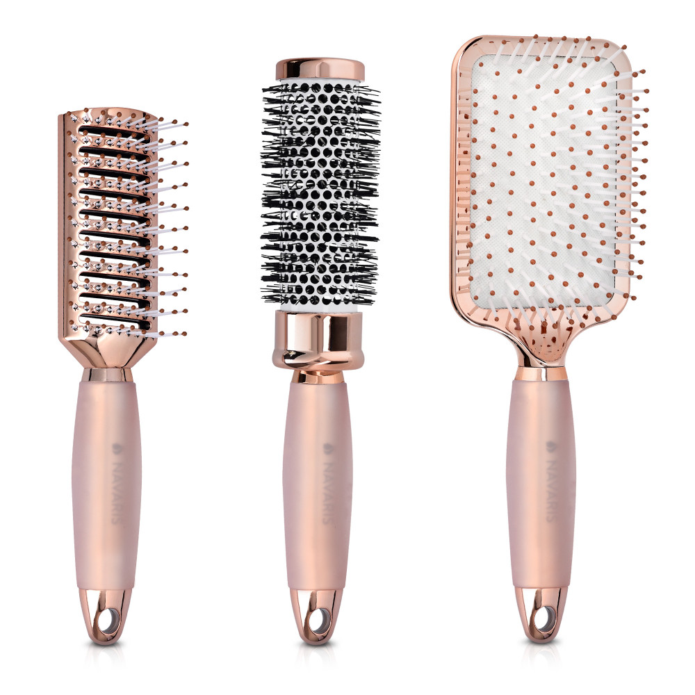 Το σετ βουρτσών Navaris είναι η τέλεια λύση για ολοκληρωμένη περιποίηση μαλλιών. Αυτό το σετ περιέχει μια στρογγυλή βούρτσα, μια βούρτσα για σκελετό και μια βούρτσα κουπιών, καθένα από τα οποία παίζει σημαντικό ρόλο στο ξέπλυμα και το styling των μαλλιών. Η στρογγυλή βούρτσα είναι ιδανική για styling μαλλιών με εφέ όγκου και η βούρτσα σκελετού βοηθάει να στεγνώσουν γρήγορα τα μαλλιά, χάρη στον ευρύχωρο σχεδιασμό της. Η βούρτσα κουπιών είναι ιδανική για να ξεμπερδεύεις τα μαλλιά και να αφαιρείς τα μπερδέματα χωρίς να τα καταστρέφει.