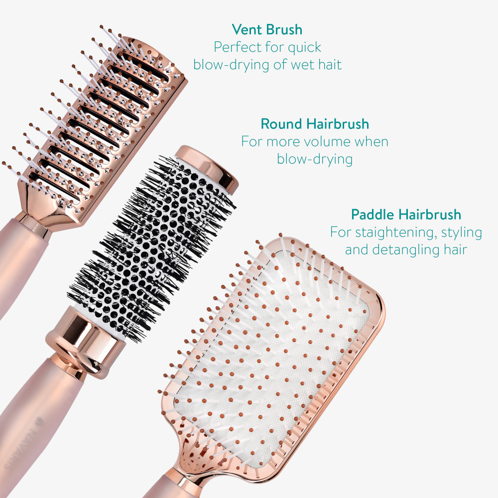 Με 3 διαφορετικές βούρτσες. ένα αεριζόμενο πινέλο, ένα στρογγυλό πινέλο και ένα πινέλο κουπιών, θα έχετε ένα πλήρες σετ πινέλων styling που θα σας βοηθήσουν να επιτύχετε την εμφάνιση που θέλετε.