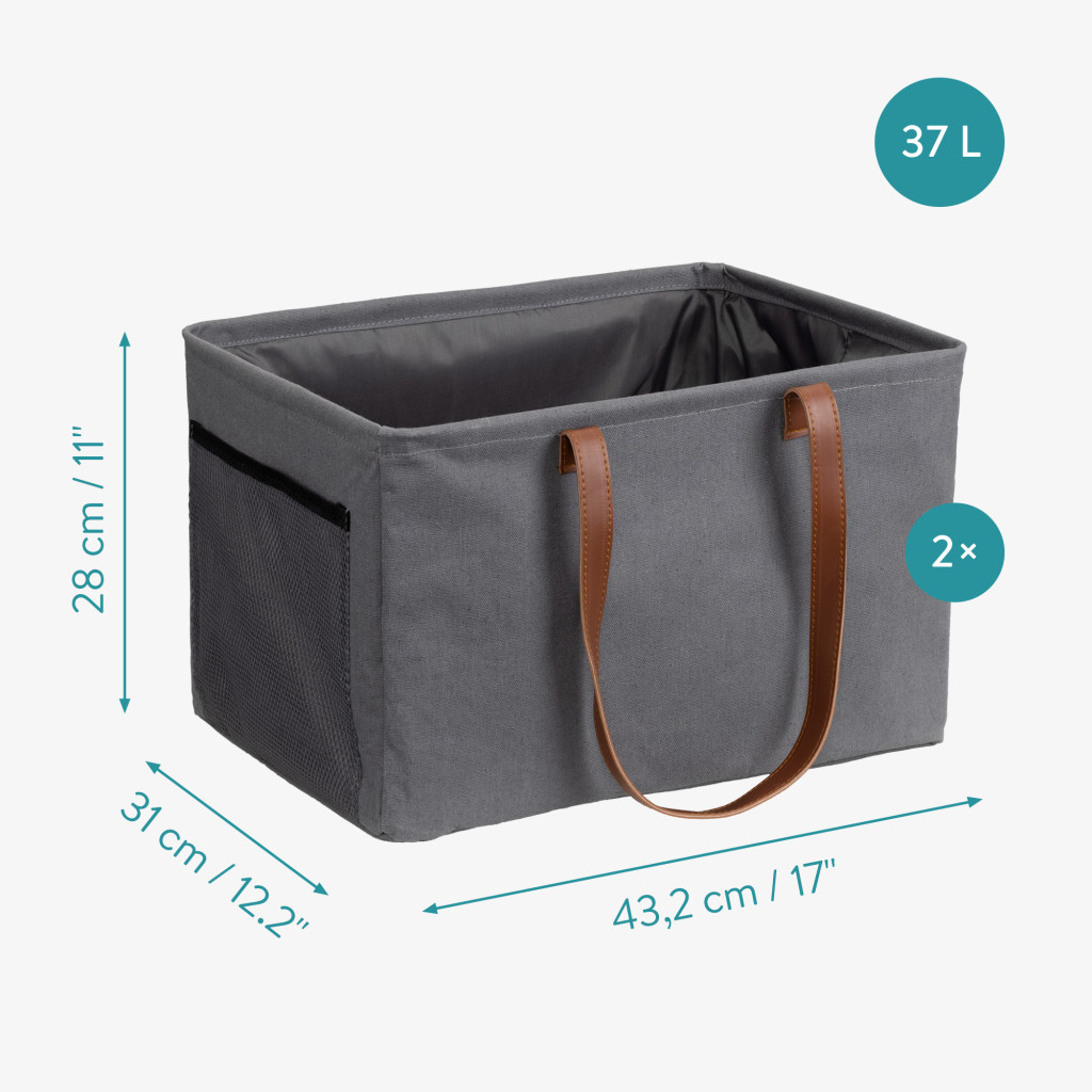 Set 2 cosuri rufe pliabile Navaris, 37 L, manere laterale si snur, 43x31x28 cm, gri/gri inchis, textil