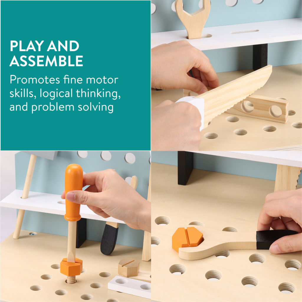 Banc de lucru din lemn pentru copii Navaris, 49x45x29, 5 cm, cu unelte incluse, maro, lemn/MDF