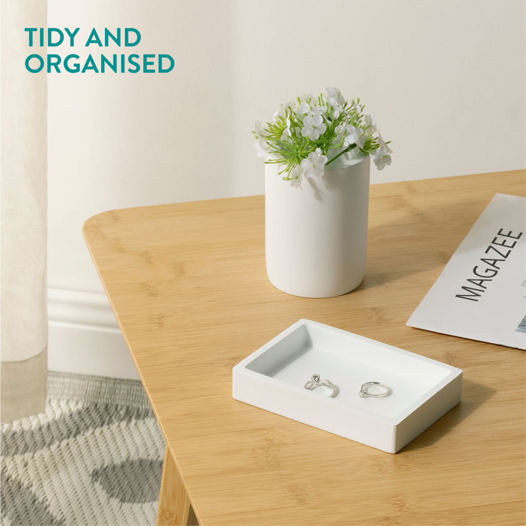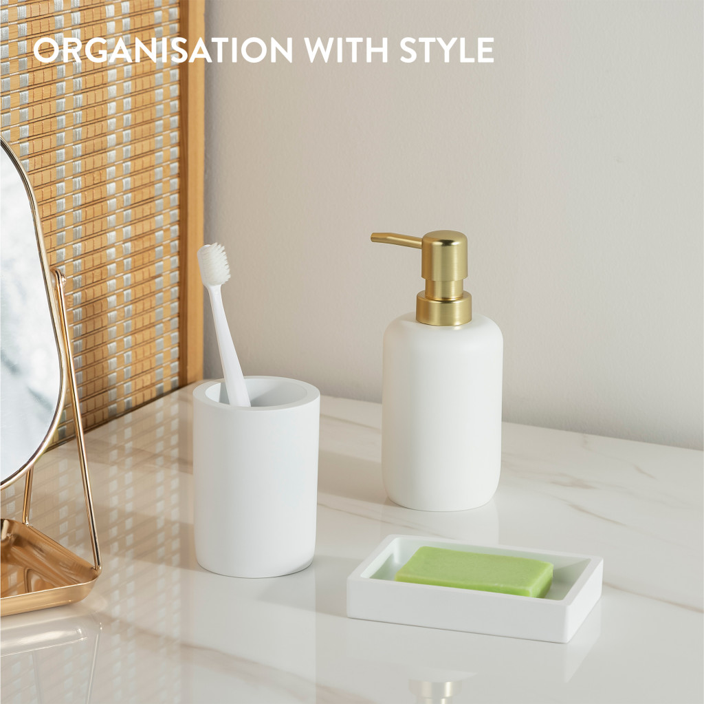 Set accesorii baie Navaris, 3 piese, suport periute, dozator si savoniera, polirasina, alb, rasina