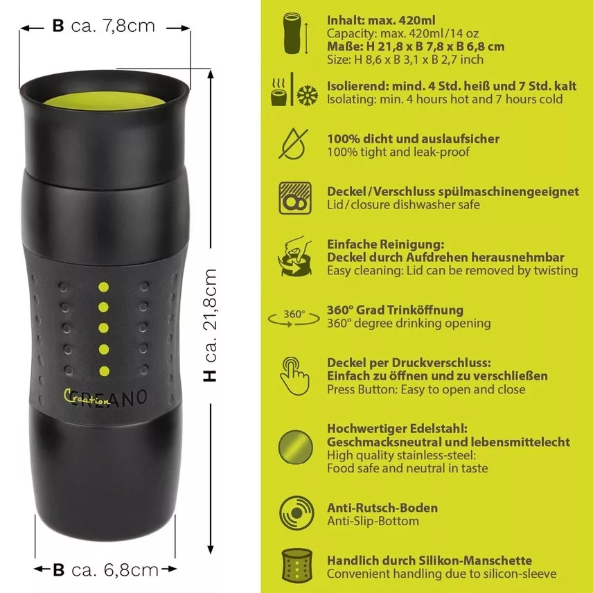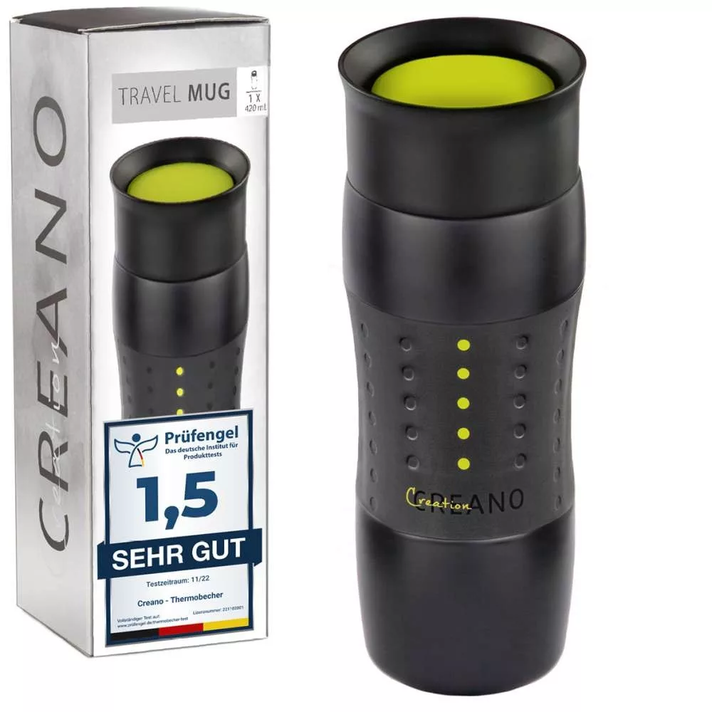 Cana termos Creano Design Travel Mug, 420 ml, inox, etansa, deschidere 360, verde