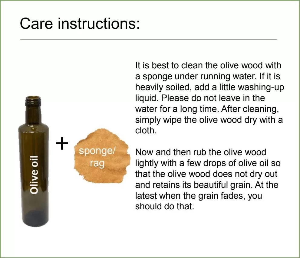 Πλύνε το μπολ στο χέρι με χλιαρό νερό (προαιρετικά με λίγο απορρυπαντικό), χωρίς παρατεταμένο μούλιασμα, και σκούπισε άμεσα. Δεν συνιστάται πλυντήριο πιάτων. Για διατήρηση της όψης, μπορείς να εφαρμόζεις περιστασιακά ένα πολύ λεπτό στρώμα βρώσιμου λαδιού.